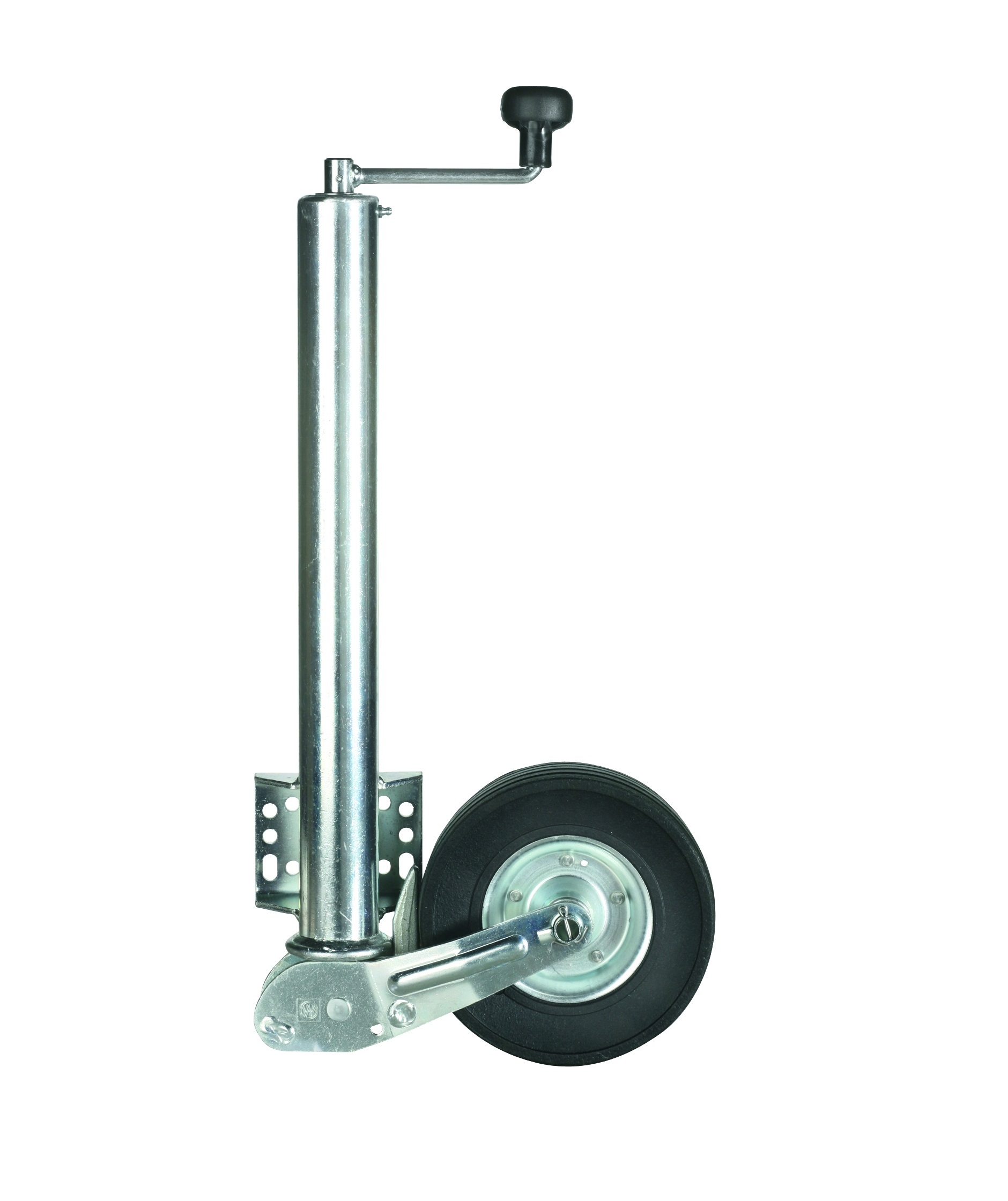 Winterhoffin vahvarakenteinen taittuva eli "automaatti" nokkapyörä jarrullisiin perävaunuihin ja trailereihin. PITKÄ MALLI (putki 570mm). Kiinnike integroitu nokkapyörään putkeen kiinni.